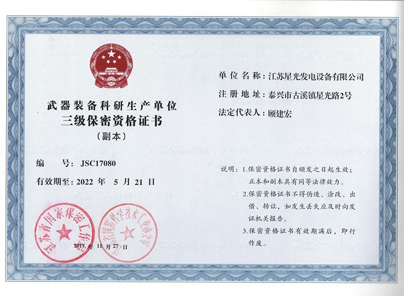 武器裝備科研生產(chǎn)單位三級保密證書(副本)